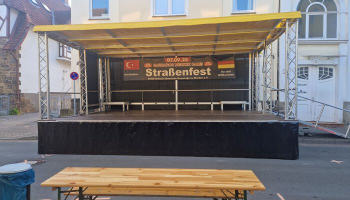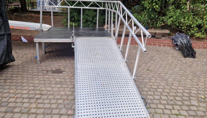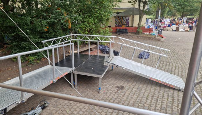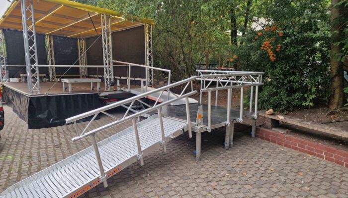 Trailerbühne 7×4 Meter, ausgestattet mit autarker Stromversorgung.